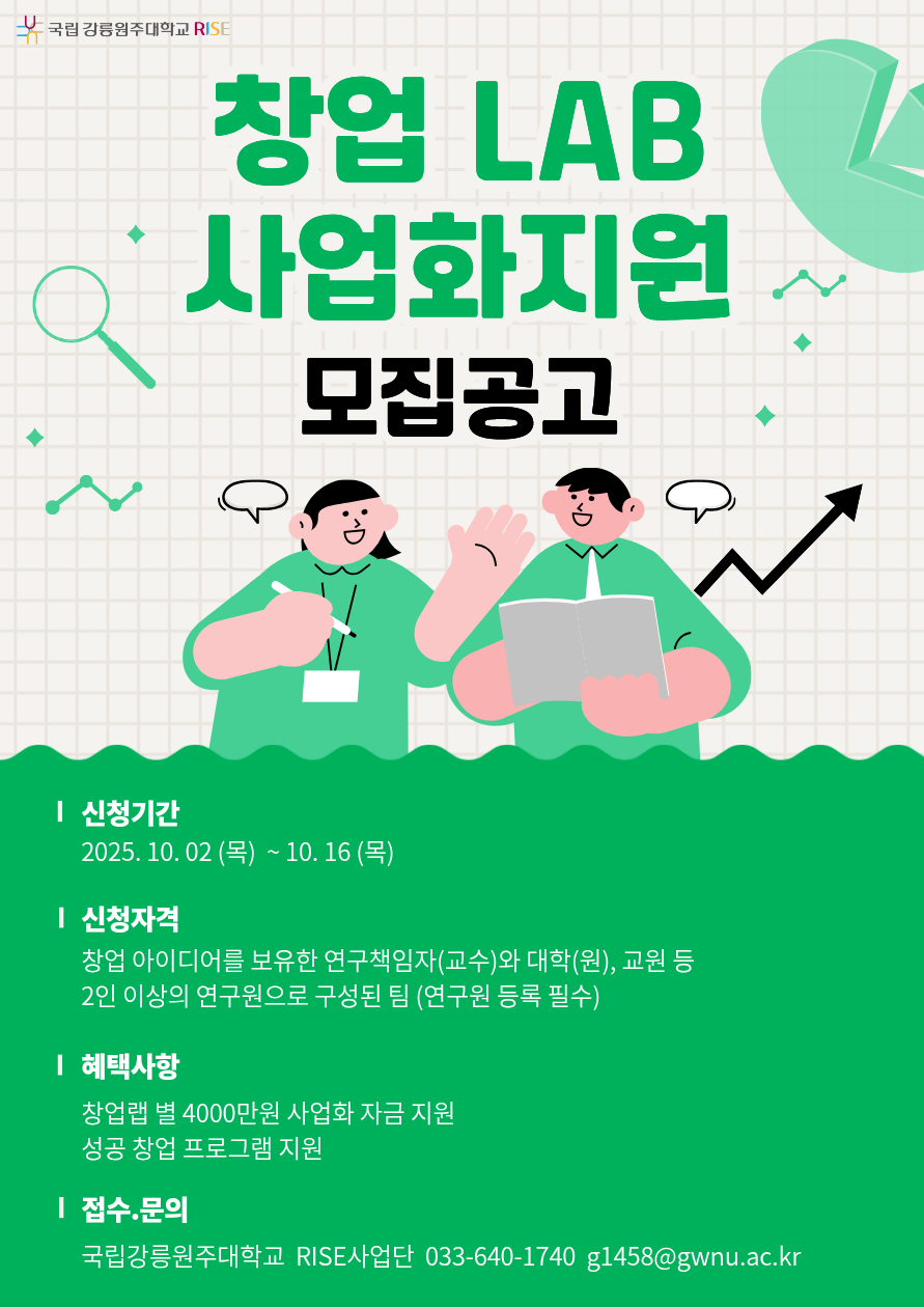 국립강릉원주대학교 RISE사업단에서는 지역 전략 및 특화산업 분야 기술을 보유한 창업랩 모집을 통한 지역산업 발전을 위해 다음과 같이 창업랩을 모집하여 운영하고자 합니다.